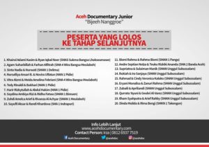 Bismillahirrahmanirrahim.. Setelah melakukan beberapa tahapan seleksi, diantaranya tahapan seleksi administrasi hingga penjurian, akhirnya Aceh Dokumentary Junior (ADJ)Â 2017 memutuskan nama-nama...
